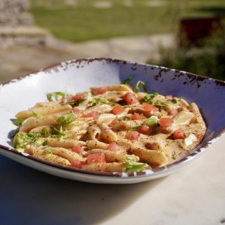 Penne pasta, Cajun cream sauce topped with onion, tomato & chives